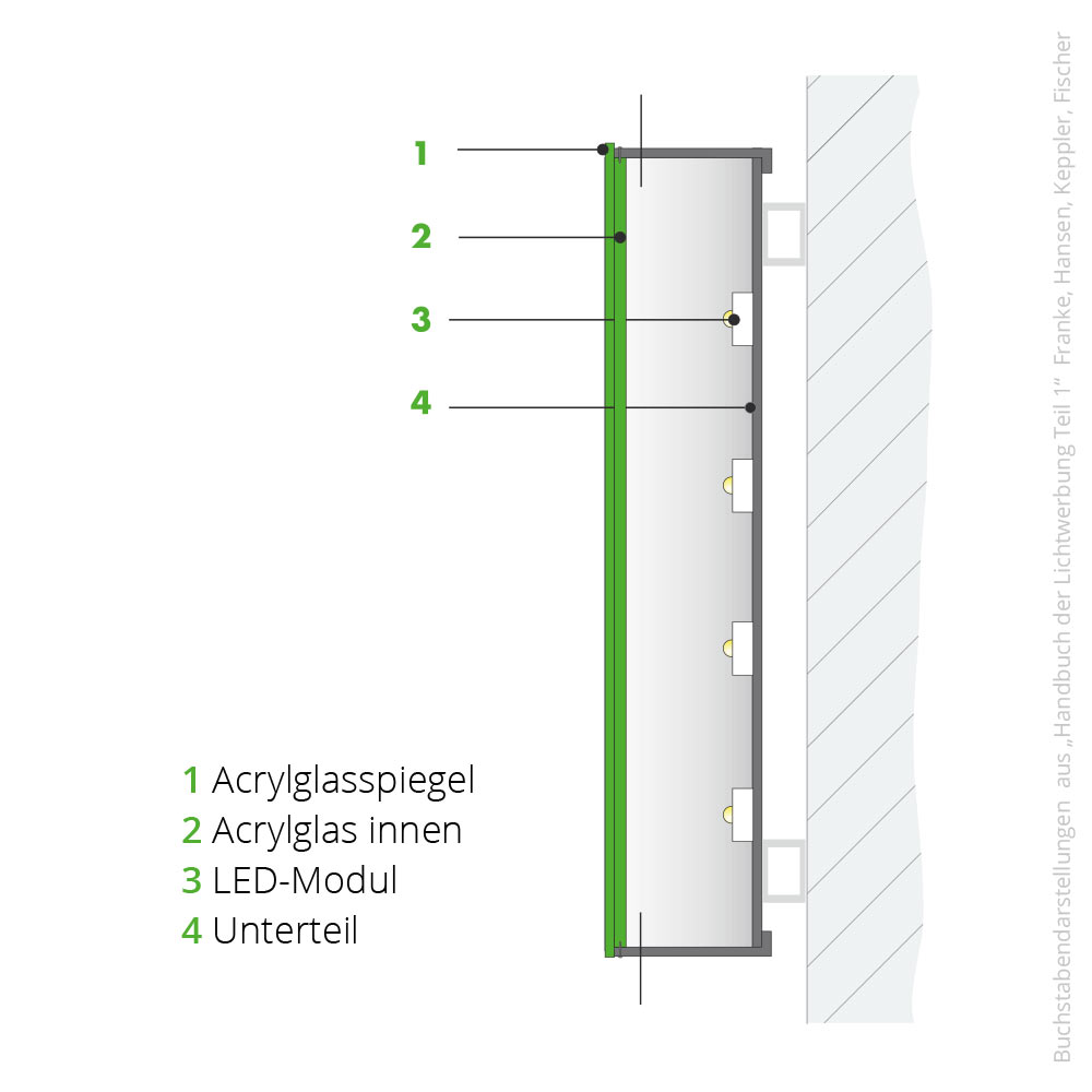 Mehrteiliger Vollreliefbuchstabe aus Aluminium Pulverbeschichtet in Standardfarben bzw. lackiert nach RAL. Acrylglasspiegel mit frontaler Ausleuchtung mit innenliegenden LEDs. Mehrstufig aufgebaut mit seitlichen Madenschrauben fixiert, dadurch keine optischer Rahmen auf dem Spiegel.