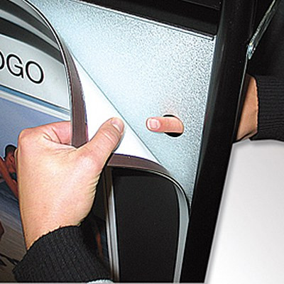 Kundenstopper aus 22 mm Stahlrohr, phosphatiert und polyesterlackiert. Rostfreie und unlackierte Alu-Zink Rückplatten. Entspiegelte APET Frontplatten mit Magnet.