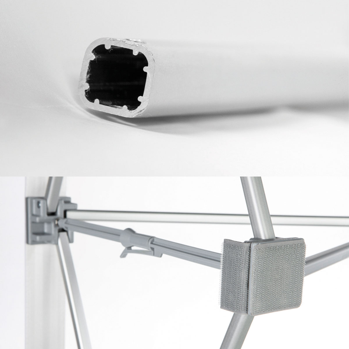 Gerade professionelle PopUp Wand. Mit einer Höhe von 220 cm und einer Breite bis zu 399cm ist die PopUp Wand die ideale freistehende Präsentationsfläche auf Messen. Die PopUp Wand ist werkzeugfrei von einer Person in wenigen Minuten aufgebaut und bestückt.